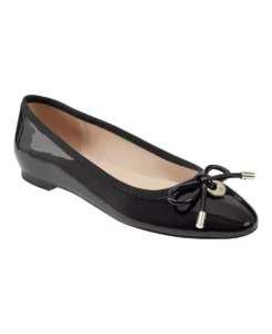 Streamlined design showcases the sleek patent construction of this contemporary ballet flat finished with a hardware-embellished bow on the vamp.