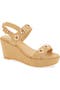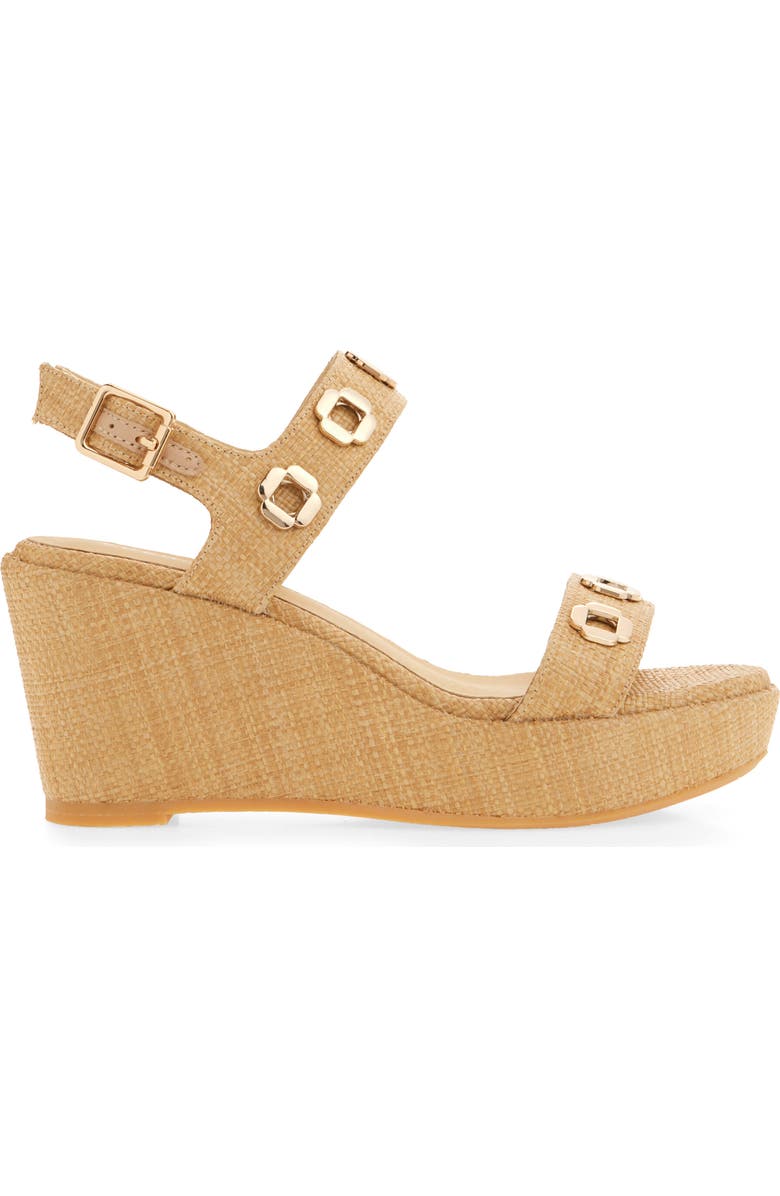 Geometric grommets enrich the straps on an espadrille-inspired sandal furnished with a cushioned footbed and lifted by a jute-wrapped platform and wedge heel.